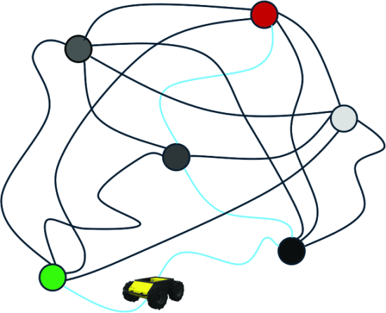 The orienteering problem is defined on a graph G where vertices have rewards and edges have non-negative costs. The goal is to find a path from an assigned start vertex (the red node in this example) to a goal vertex (the green node) that maximizes the sum of collected rewards while ensuring the path cost does not exceed a given budget, B